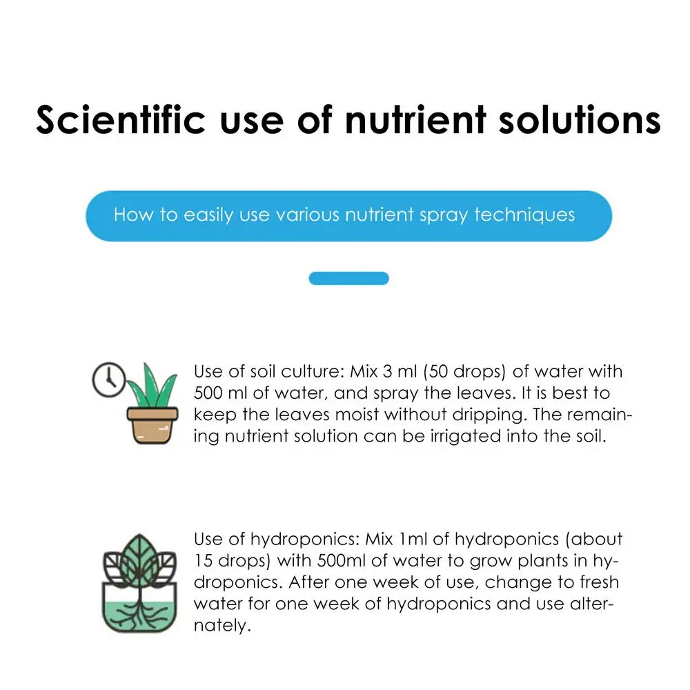 Use of hydroponics: Mix 1ml of hydroponics (about 15 drops) with 500ml of water to grow plants in hydroponics. After 1 week of use, change to fresh water for 1 week of hydroponics and use alternately.