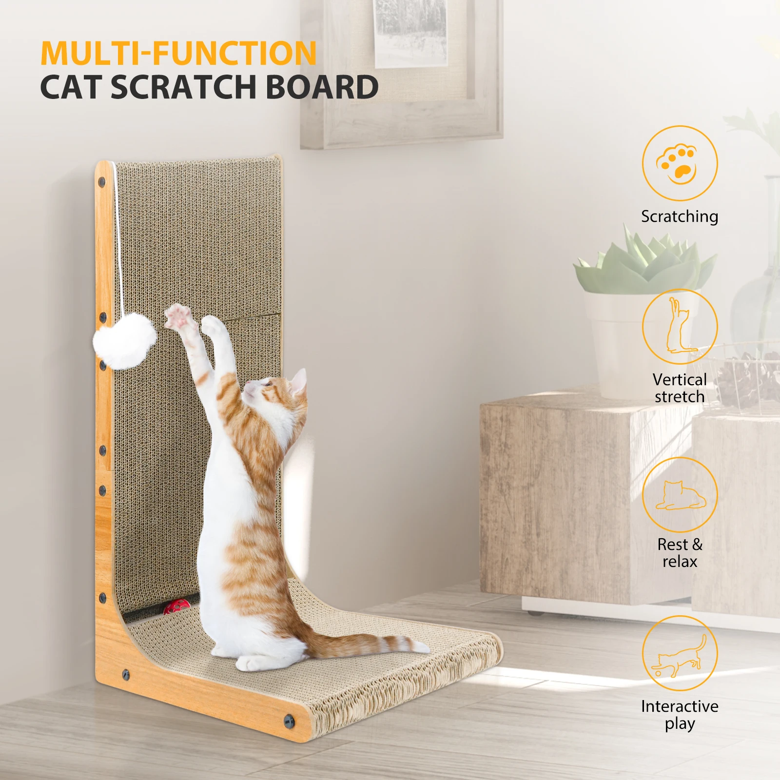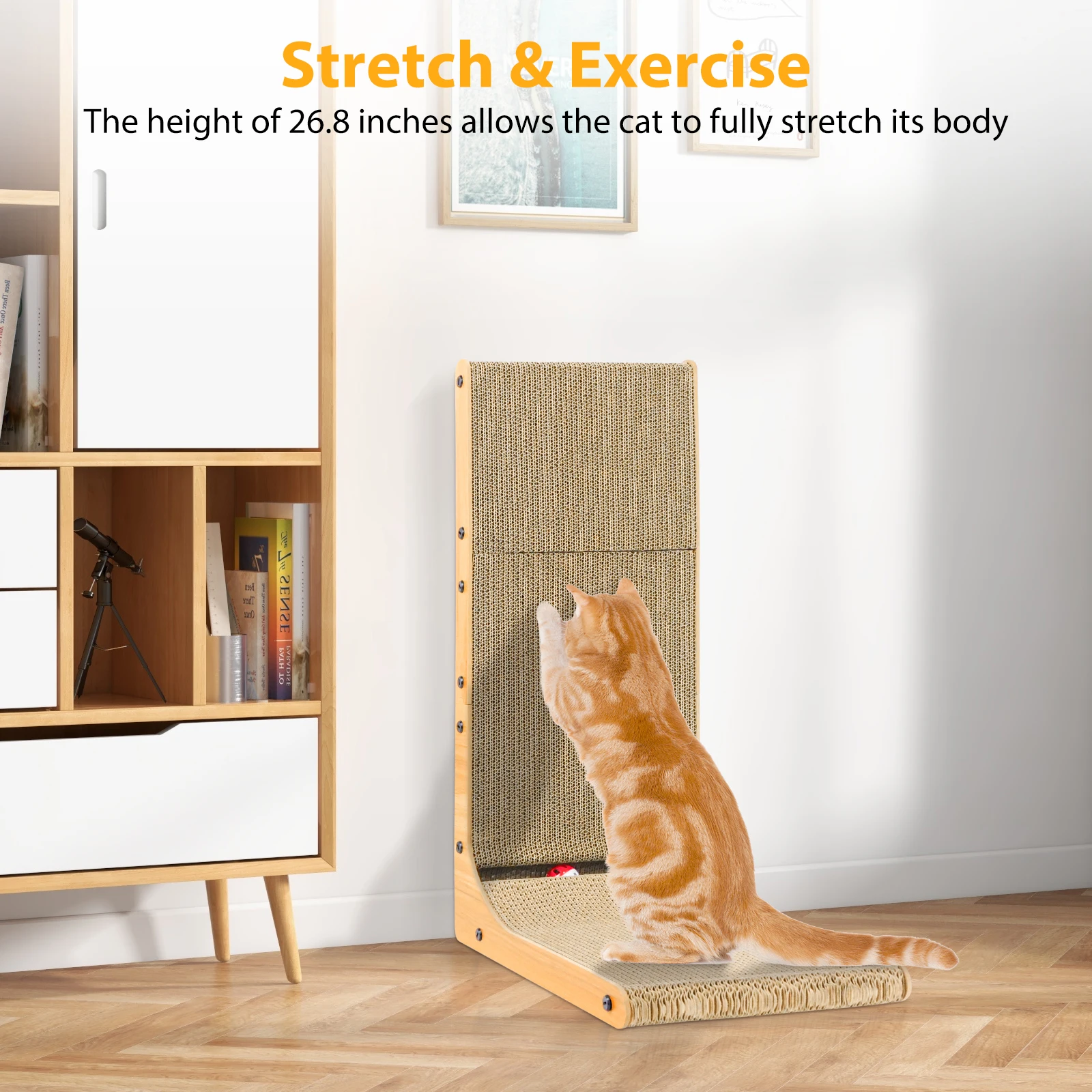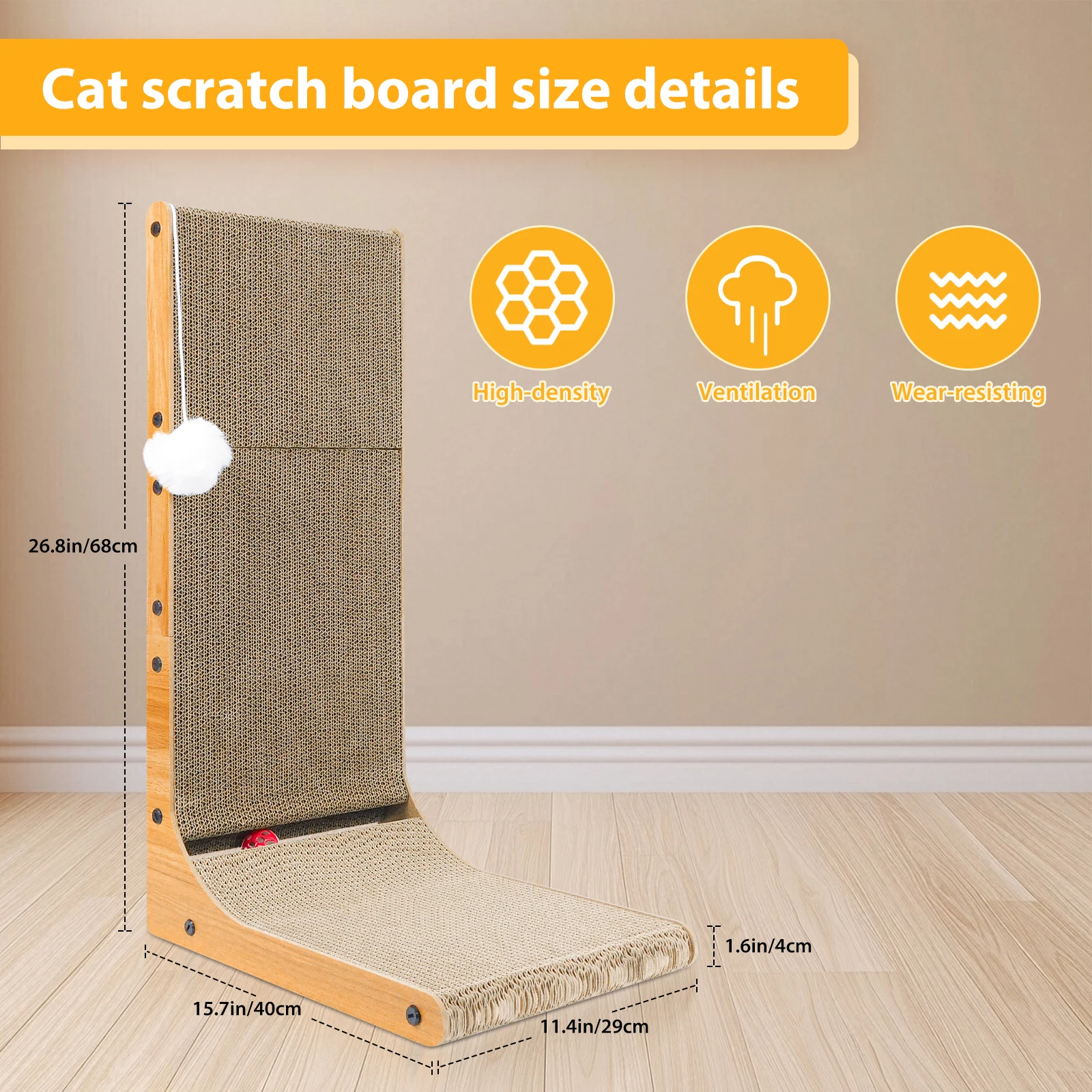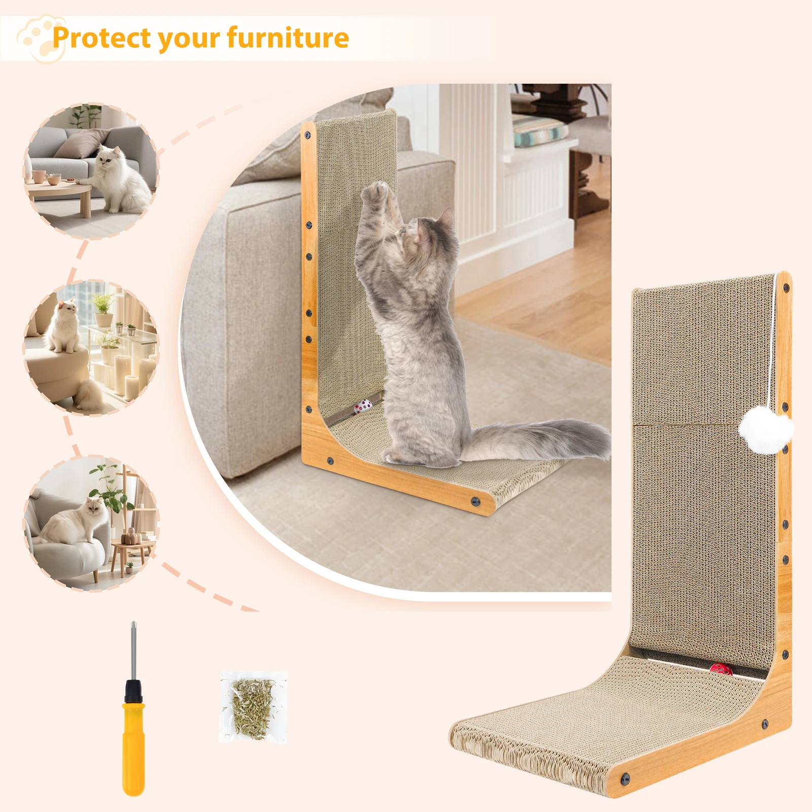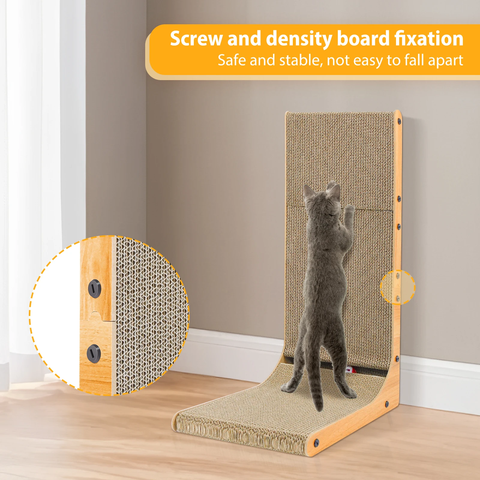 Large-size Cat Scratcher : The cardboard cat scratchers size is 29 X 40 X 68cm, and the 68CM height L-shaped scratching conforms to the natural scratching instinct of cats, allowing them to scratch upwards. It helps release their scratching impulse and protect your precious furniture.