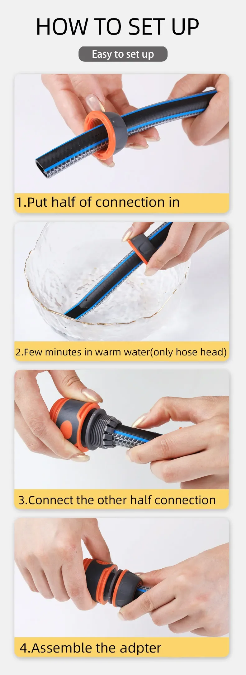 1. Put half of the hose adapter in the hose